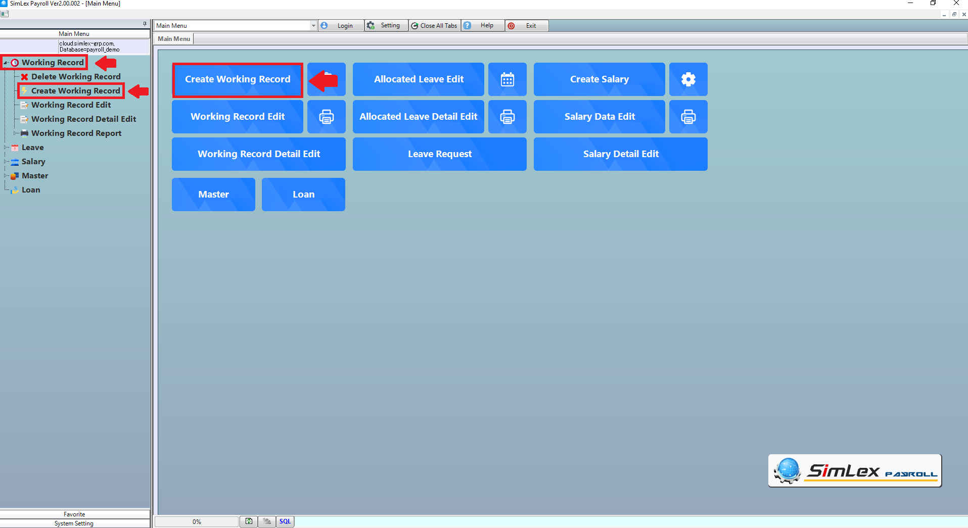1. Click<Create Working Record>from the main menu or double-click from the left menu. <Working Record> double-click menu <Create Working Record>