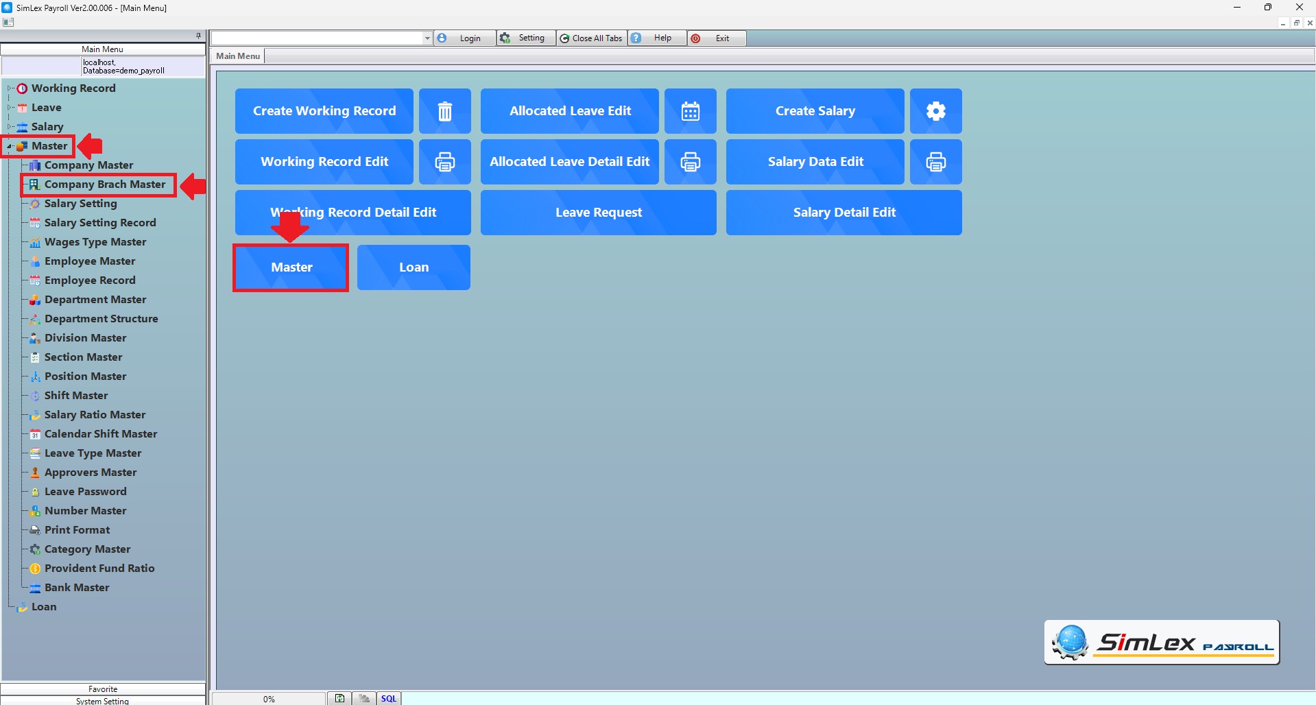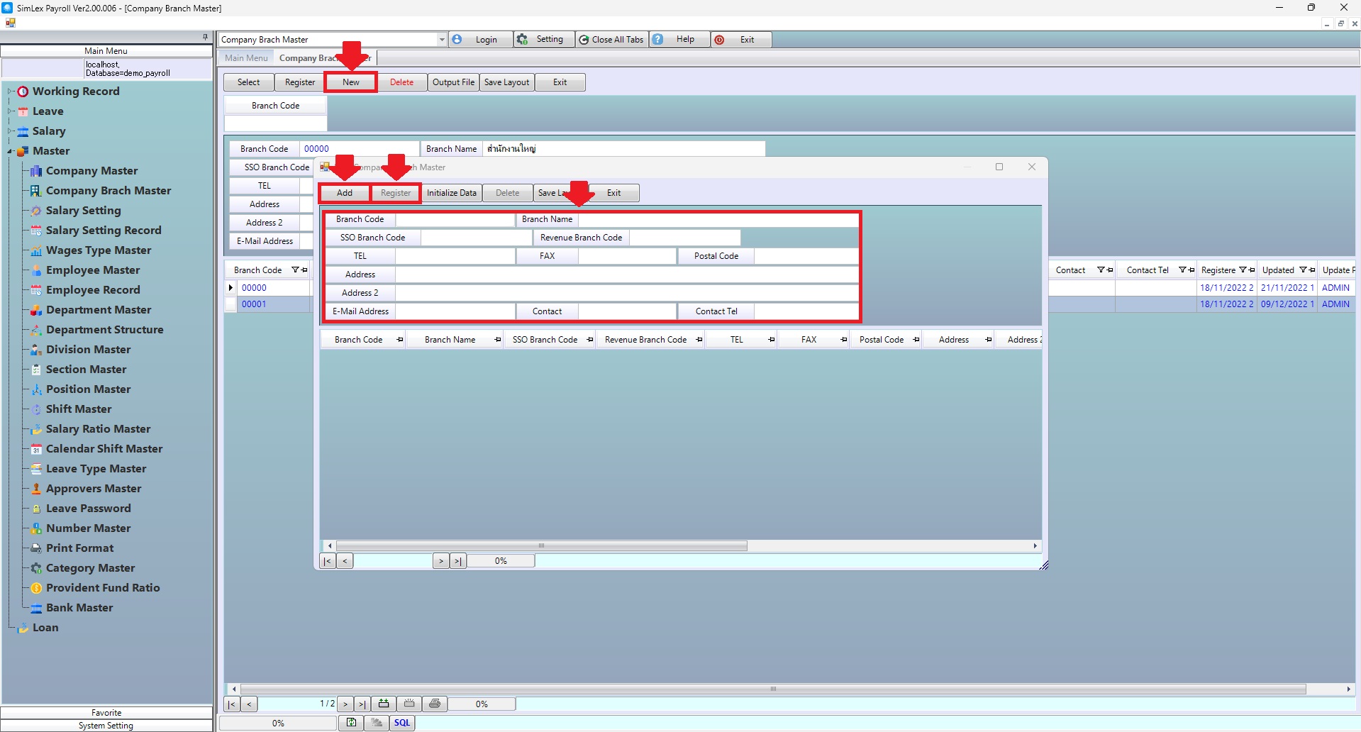 1. Click <Master> from the main menu or double click from the left menu <Master> and then double click on the menu <Company Branch Master>.
