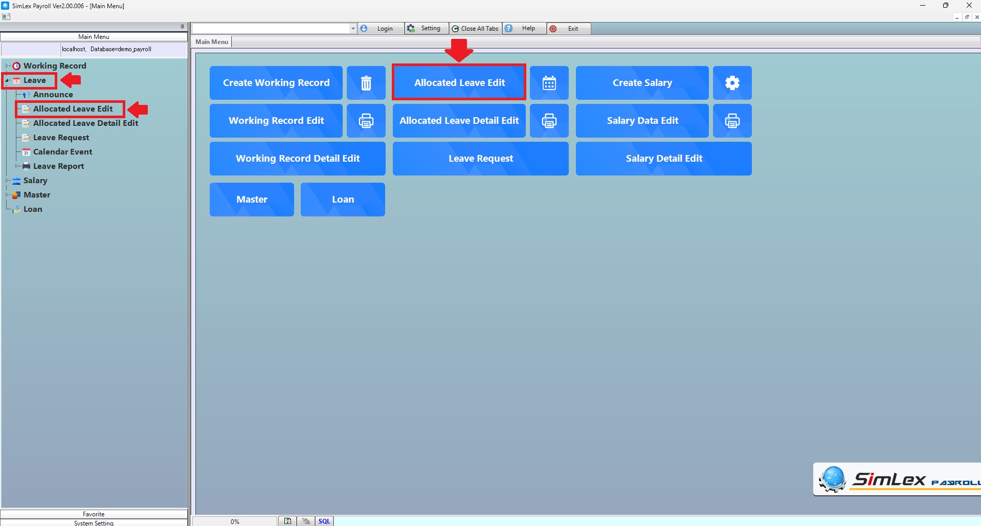 1.Click <Allocated Leave Edit>from the main menu or double click from the left menu. <Leave> double click menu. <Allocated Leave Edit>