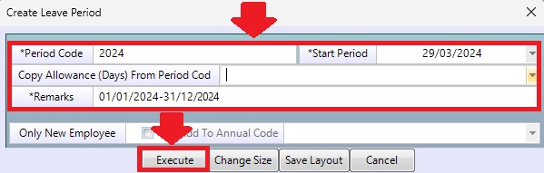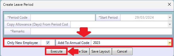 If there is a new employee during the leave period. Check checkbox <Only New Employee> Click the time period code you created. <Add to annual code> and then click <Execute>