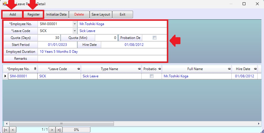 In the case of adding a type of leave for employees, click <Add Leave Type>, then fill in the information and click <Add> . When finished, click <Register>.