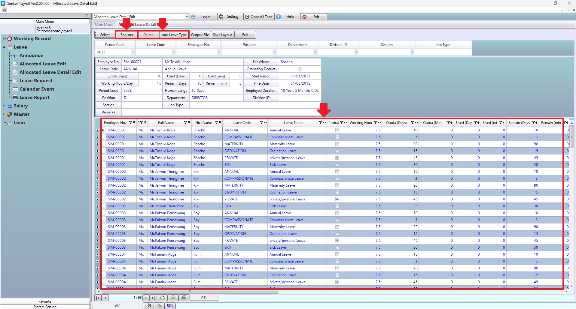 1. Click <Allocated Leave Detail Edit> from the main menu or double click from the left menu. <Leave> double click menu. <Allocated Leave Detail Edit>