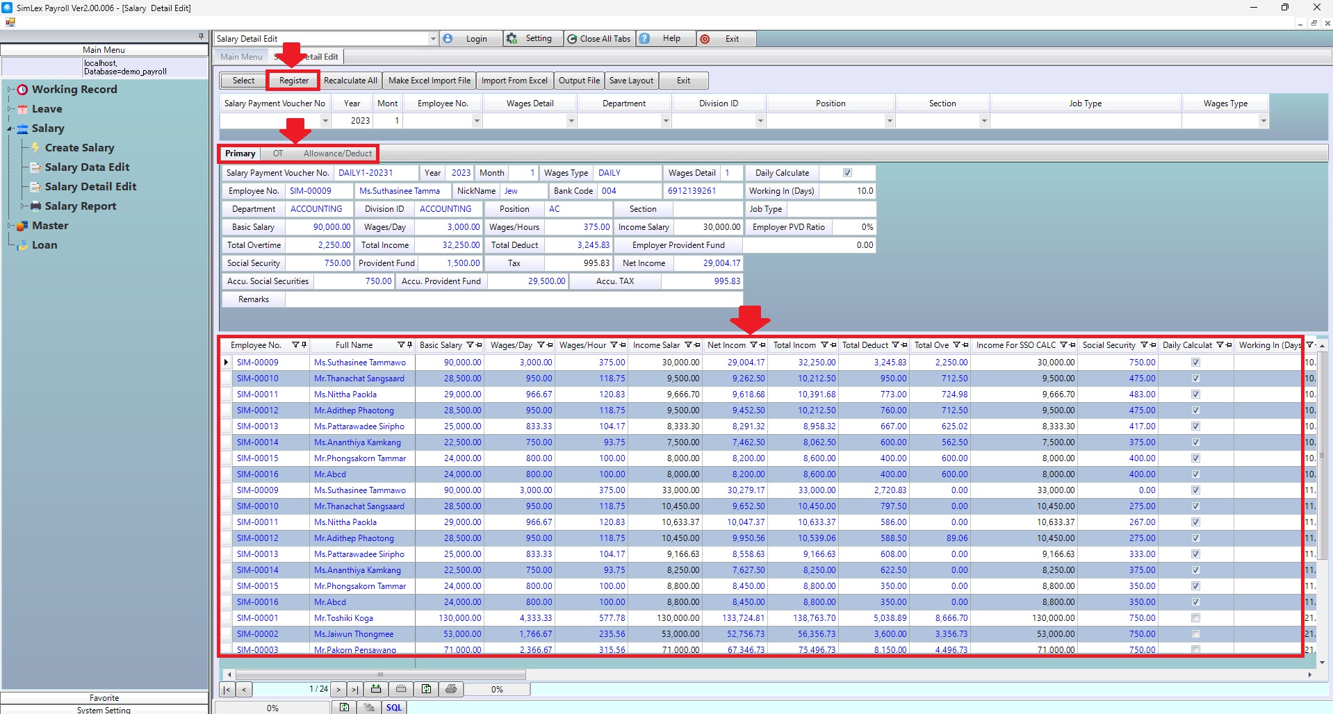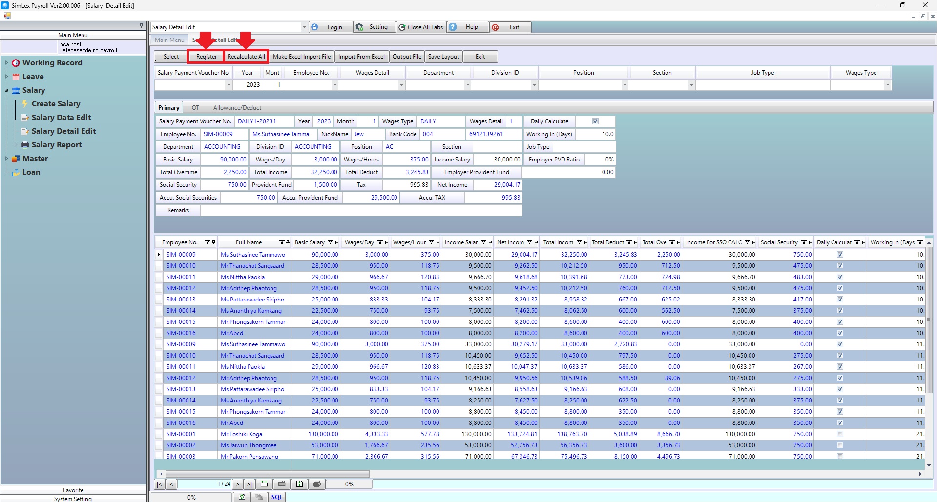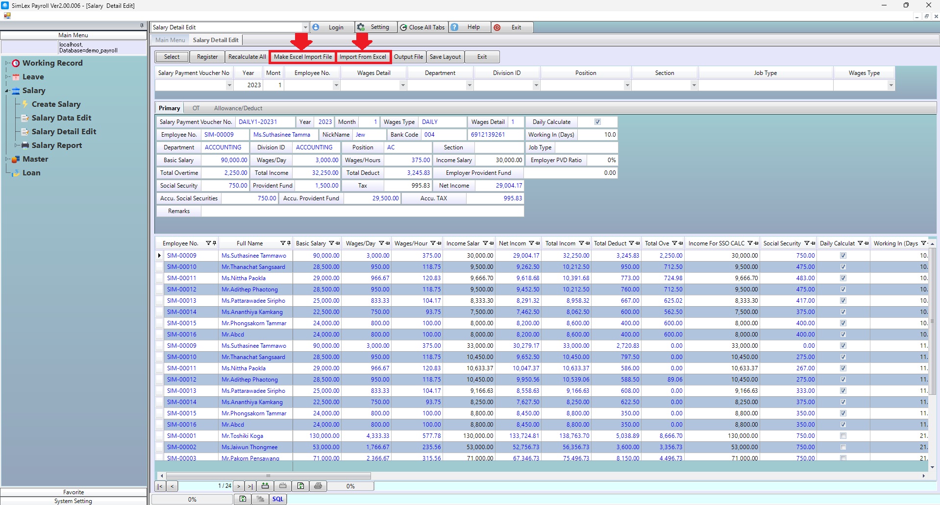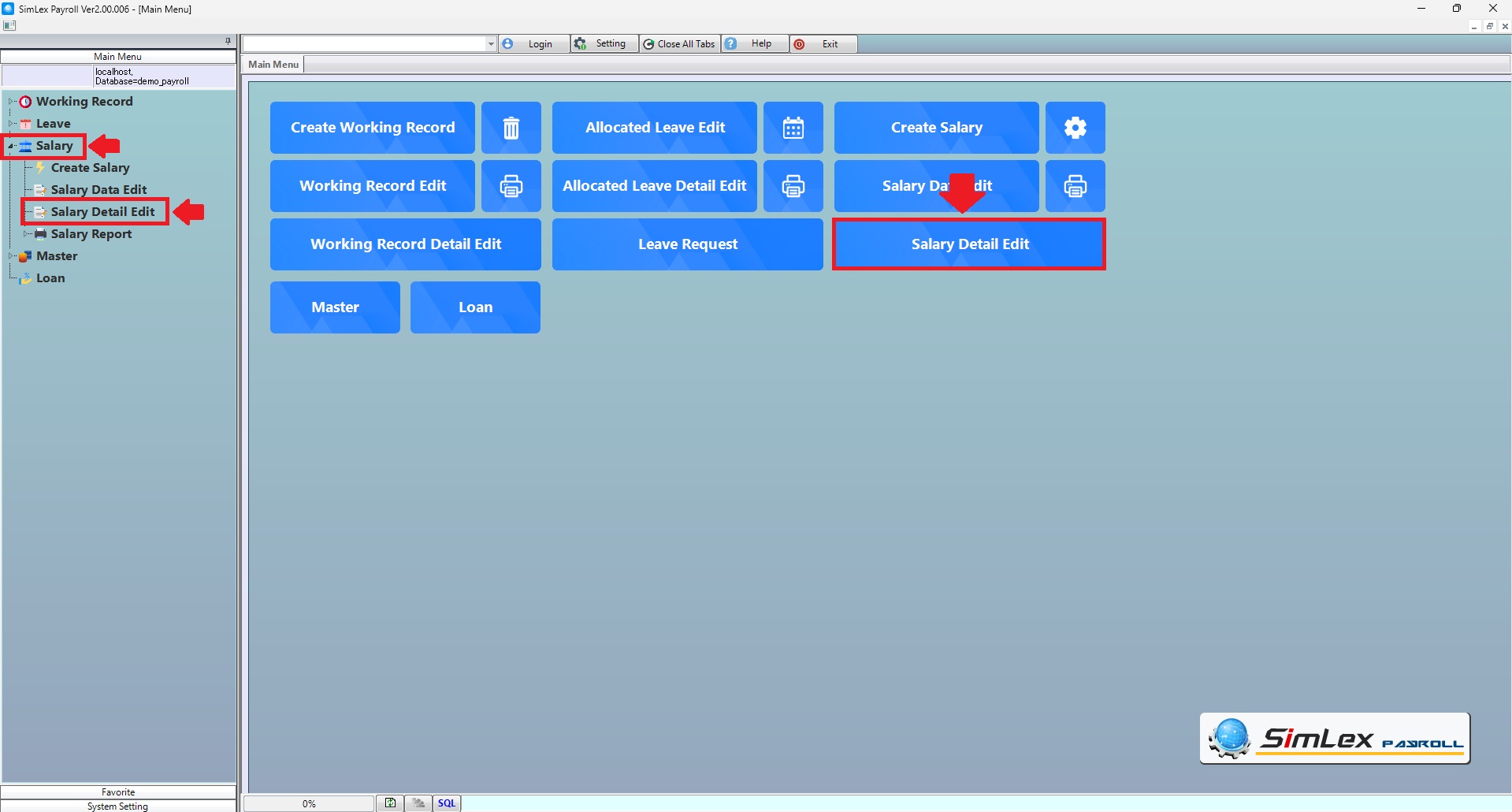 1. Click <Salary Detail Edit> from the main menu or double click from the left menu <Salary> and then double click on the menu <Salary Detail Edit>.