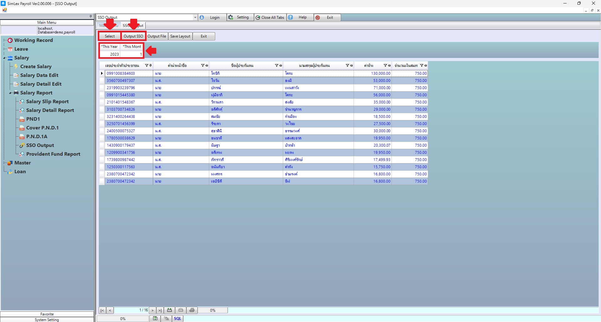 1. Click<Icon Printer> from the main menu or double click from the left menu <Salary>, then double click on the menu <Salary Report>. The system will display 7 submenus, then click <SSO Output>.