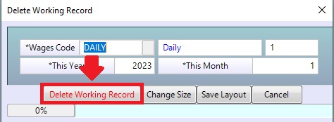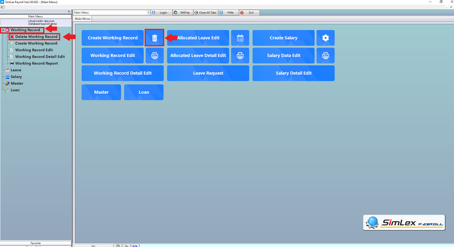 1. Click icon trash from the main menu or double click <Working Record> from the left menu, then double-click menu <Delete Working Record>