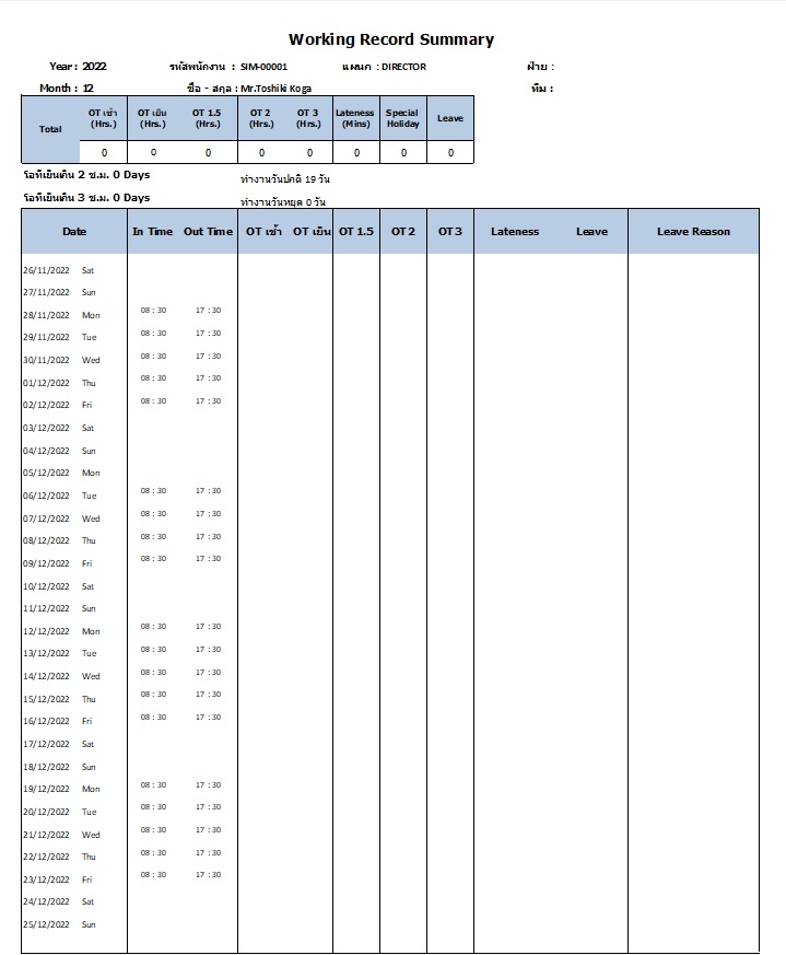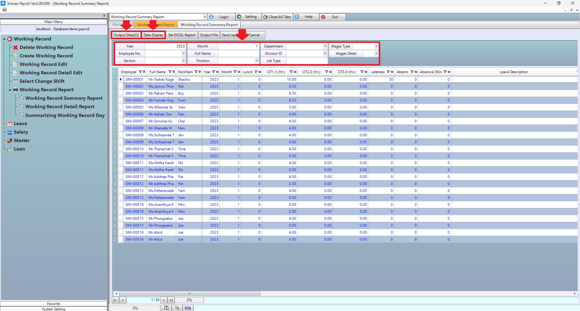 1. Click<Printer Icon> from the main menu or double click from the left menu. <Working Record> double click menu<Working Record Report>.