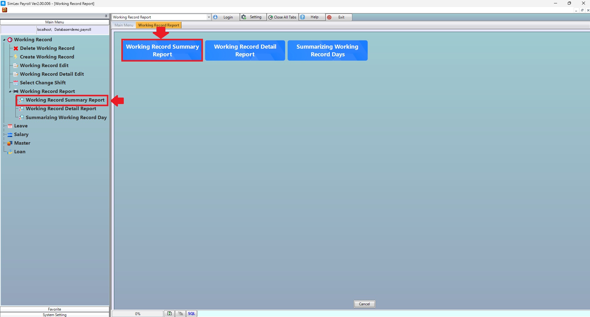 The system displays 3 sub menus. Click <Working Record Summary Report>.